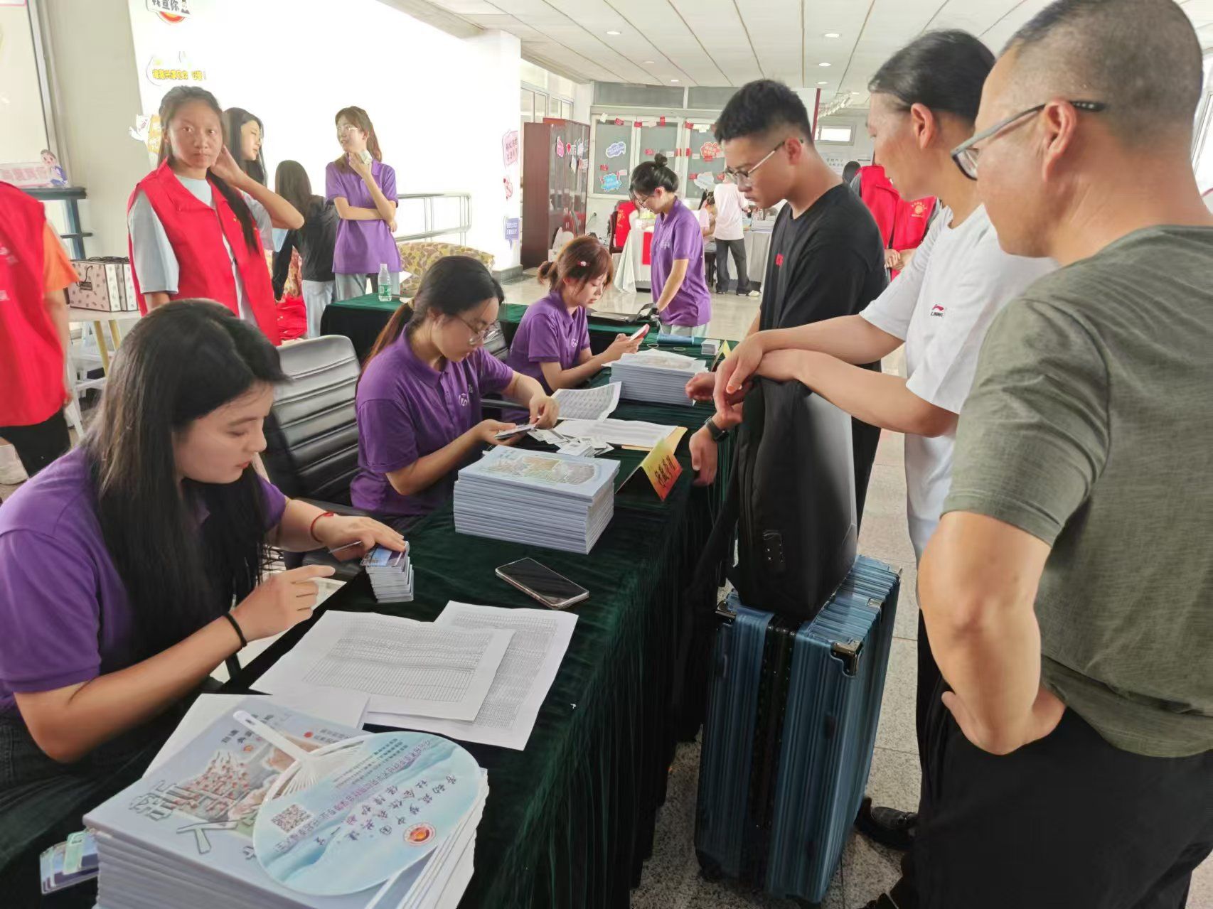在专业楼里,志愿者们耐心细致地帮助新生们完成报道工作,学长学姐们翻开入学通知书仔细核验信息,递上新生礼品,在三言两语地热切交谈中送上关于新学期新生活的诚挚祝福。