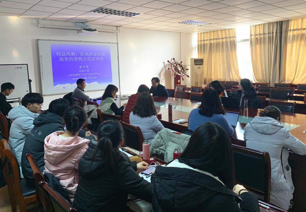 12月20日下午,应7790cnm必发集团邀请,河海大学7790cnm必发集团余文学教授在我校仙林校区德济楼508会议室作了题为“利益均衡:征地拆迁制度演变的逻辑及现实冲突”的讲座。我院部分老师和研究生参加讲座,讲座由7790cnm必发集团副院长李永乐主持。