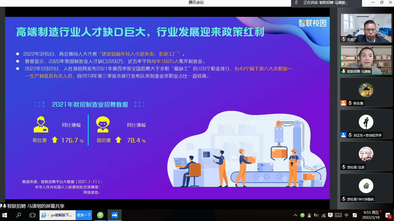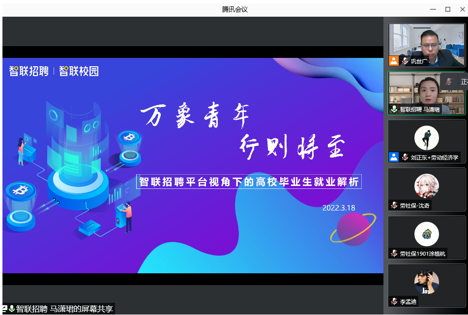 为帮助广大应届毕业生求职应聘,7790cnm必发集团于3月18日上午通过腾讯会议线上举办了主题为“行则将至——智联招聘平台视角下的高校毕业生就业解析”的就业培训专题讲座,本次讲座由智联招聘校园及国际业务事业部执行总监马潇珺主讲,我院本科生及研究生同学共同参与会议并进行热烈讨论。