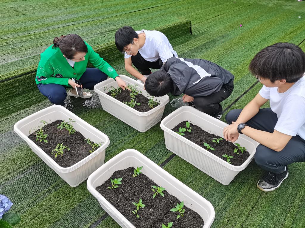 在活动中,每个班级都来认领了属于自己的一隅耕地和花草、瓜果苗。绿色的大草坪上,三尺讲台上的教书先生化身为真园丁,学生们当起了“护花使者”,有条不紊地把有机土壤倒入花盆,小心翼翼地将种子埋进去,把瓜果苗栽进去。大家三五成群,或拿着小铲子给种子松土,或拿着新鲜的肥料给瓜果苗施肥,或谈论着最近周围发生的趣事…..“我们班种的花一定最美!”“我们班种的西红柿一定最甜!”现场一片欢声笑语,同学们忙得不亦乐乎。
