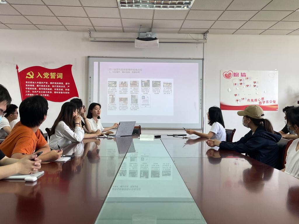 童璟晓同学讲述了暑期实践活动的宣传工作要点,她从稿件格式、基本要求、图文视频细节、文件打包等方面为同学们答疑解惑,指出在撰写新闻稿时要紧扣实践过程、突出实践主题,反映实践意义、总结实践收获。随后,她向同学们介绍了投稿流程,提醒各支队伍在实践过程中要及时向校、院两级新闻平台,如百舸网、南财百舸以及南财公管院youth公众号投稿,同时鼓励大家向中国青年网、当地报社等媒体平台投稿。