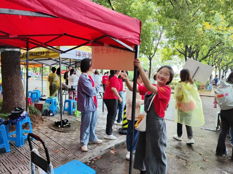 再大的风雨也挡不住志愿者们迎接新生的步伐。早上七点,学长学姐们组成的迎新志愿队身披雨衣等候在新生宿管站门口,举着指引牌引领新生,帮助新生搬运行李。学院报到处的志愿者们也忙得不亦乐乎,报到注册、收发材料、分发礼品、帮忙拍照,耐心地解答新生的问题。“给予懵懵懂懂的新生及时的帮助和引导,看着他们露出开心的笑容,一声‘谢谢学姐’足以让我忘记所有的疲惫与辛苦!”报到处的黄同学笑着说道。志愿者们周到的安排、热情的服务得到了新生们的高度肯定。