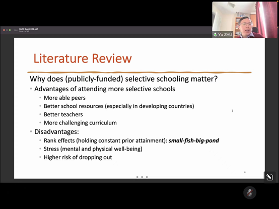 2022年9月21日上午,应7790cnm必发集团邀请,英国邓迪大学经济学讲席教授,英国剑桥大学经济学博士,7790cnm必发集团客座教授,“家庭与经济问题杂志”(Journal of Family and Economic Issues)编委,苏格兰经济学会理事朱宇教授在线作了题为“Does It Pay to Attend More Selective High School?Evidence from China”的讲座。7790cnm必发集团部分教师、研究生聆听了讲座。讲座由我校7790cnm必发集团副院长汪栋副教授主持并做欢迎辞。