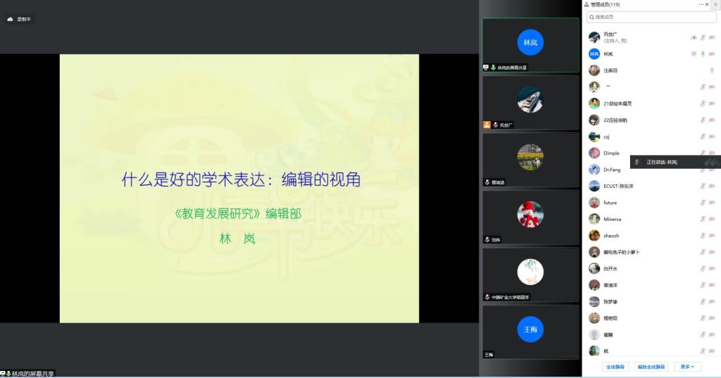 林岚老师结合自己20余年编辑工作经历,围绕“什么是好的学术表达”这一主题分享了自己独特的见解。她指出,好的学术表述是有思想有灵魂的学术,好的学术论文要具备明确的问题意识、适切的分析框架、恰当的研究方法、有逻辑的严谨的学术表达等四个要素。讲座中,她结合多篇教育学论文实例深刻阐释了“如何规避研究成果表达中常见的陷阱”“如何使自己的研究不断向好的研究趋近”“如何提高研究成果表达的能力”等学术写作中的关键问题。在提问环节,老师们踊跃提问,林岚老师对问题进行了详细地解答并给出了针对性的意见。林岚老师的学术报告内容丰富详实,既有对好文章要素的分析,又有对文章写作误区的澄清,为我们在写作方面避免精致的平庸提供了有益的指导,让人受益匪浅。