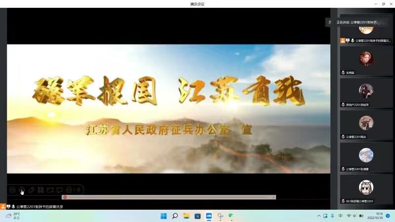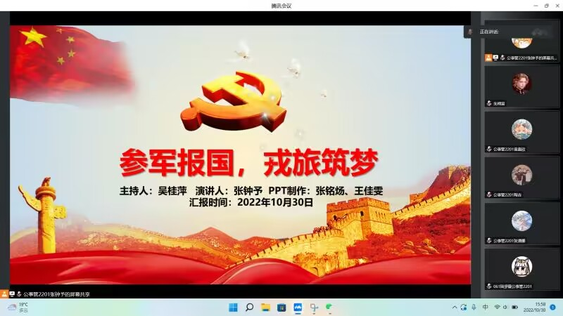 为深入学习贯彻党的二十大精神,积极响应国家征兵号召,帮助同学们了解征兵政策,同时激发大一大二学生参军报国热情,我院在10月30日成功开展征兵宣传主题线上讲座。