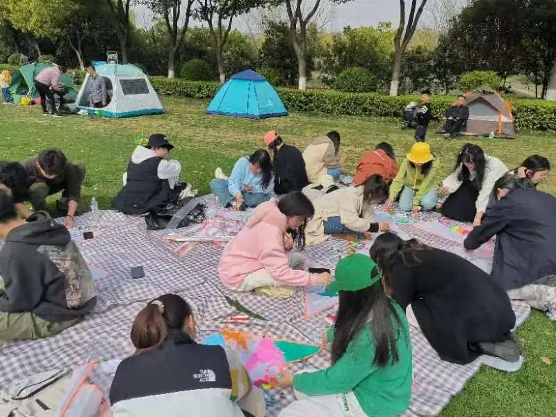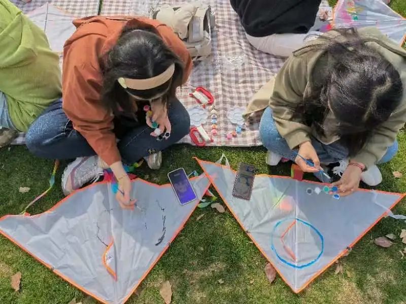 活动开始前,我院学生会负责人提前在羊山公园进行了活动地点的环境踩点,并铺好野餐垫,完成了场地布置,为同学们进行风筝绘画做好了准备。当天下午,同学们一起来到了羊山公园。大家围坐在野餐垫上,一人一组或两人一组开始了天马行空的想象和创作。有人照着手机小心翼翼地在风筝上描绘,画上自己喜欢的角色;有人则自信地打开颜料盒大笔挥画,让色彩在缤纷的世界里自由碰撞;也有人在风筝上书写愿望或是生活中所遇到的烦恼,希望心愿能够实现,而烦恼可以随春风一同扬升消散。