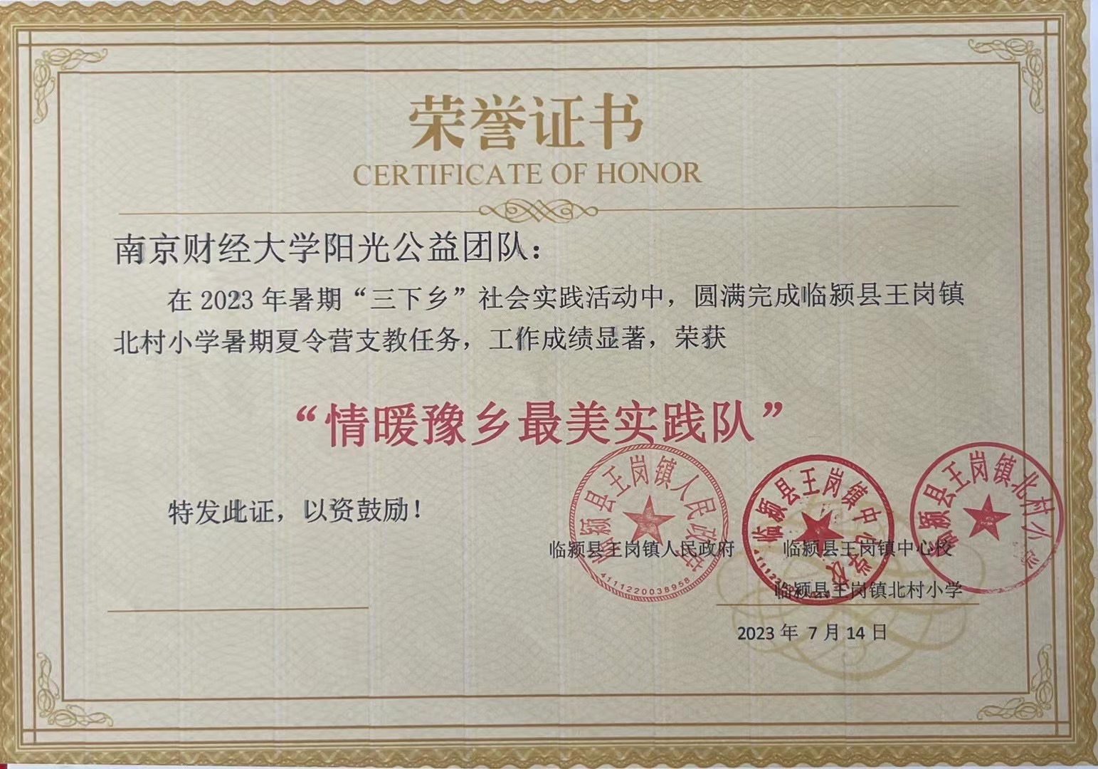 为表彰“阳光公益团队”在本次暑期夏令营中的出色支教工作,临颍县王岗镇人民政府、王岗镇北村中心校联名为“阳光公益团队”颁发了“情暖豫乡最美实践队”荣誉证书,为团队核心成员颁发了“情暖豫乡先进个人”荣誉证书