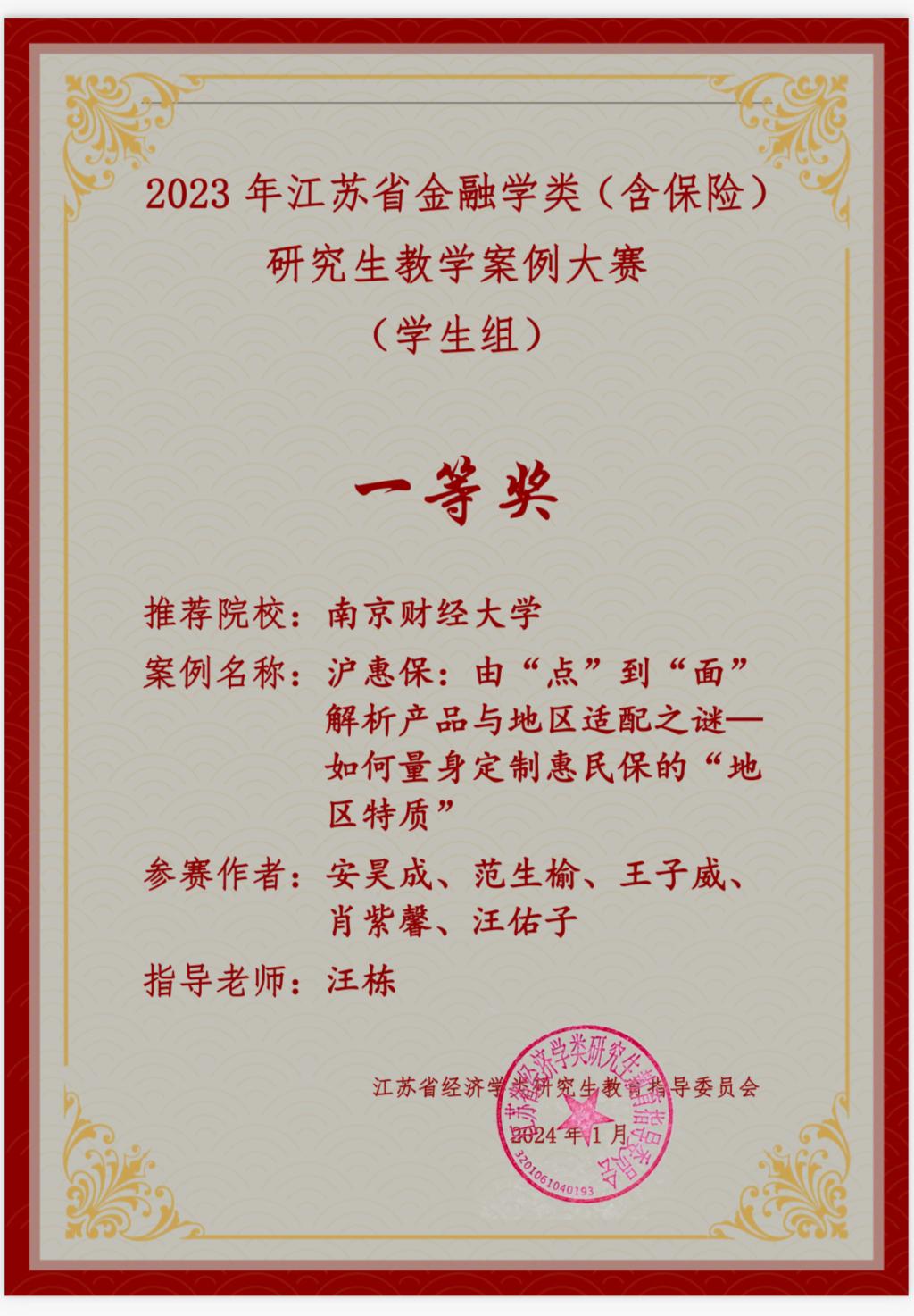 3月12日,由江苏省经济学类研究生教指委主办的江苏省金融学类(含保险)研究生案例大赛公布结果,我院21级应用经济学研究生王子威、23级公共管理学研究生肖紫馨、安昊成的保险类分析作品《沪惠保:由“点”到“面”解析产品与地区适配之谜——如何量身定制惠民保的“地区特质”》荣获江苏省一等奖。