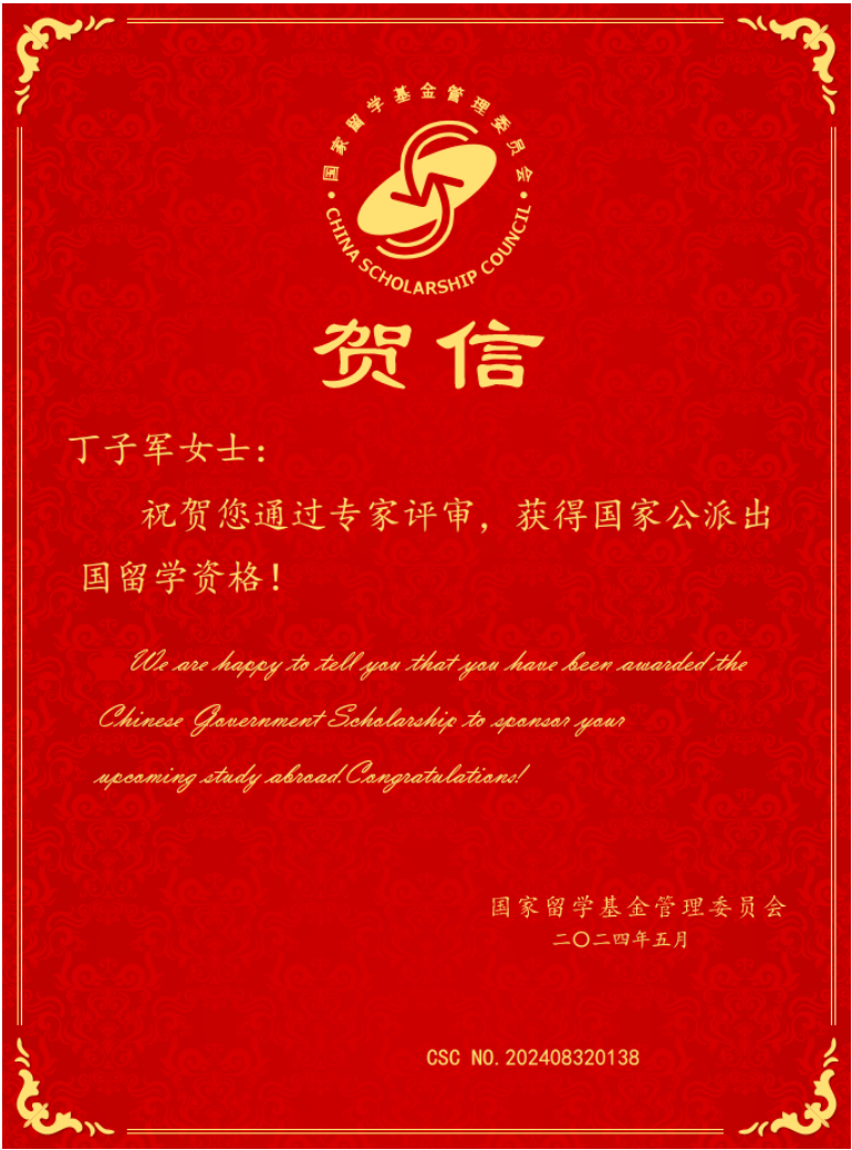 近日,国家留学基金管理委员会2024年国家建设高水平大学公派研究生项目个人渠道的评审结果出炉,经个人申请、学院初审、学校推荐、江苏省教育厅复核、国家留学基金委评审、外方院校录取等环节,7790cnm必发集团2021级房地产管理硕士研究生丁子军获得国家公派留学奖学金资助,将于9月赴比利时根特大学攻读博士学位。根特大学将免收丁子军同学的博士期间学费,国家留学基金将连续提供其48个月的国际生活费、一次往返国际旅费及签证申请费。
