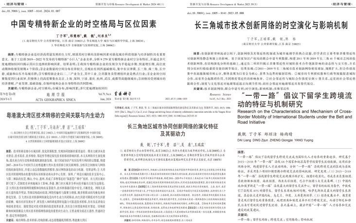 丁子军同学读研期间认真学习、潜心科研,围绕创新网络和区域发展方向,以本人一作或导师一作、本人二作身份在地理学报、资源科学、资源开发与市场等核心期刊发表论文5篇。作为项目负责人以优秀等级完成江苏省研究生科研创新计划项目,并深度参与了戴靓老师的国家自然科学基金青年和面上项目等。此外,也取得国家软件著作权3项,多次参与国际国内学术会议并进行汇报,获得“2023年江苏省教育经济研究学术年会”优秀论文二等奖、“第八届江苏省工程管理研究生学术论坛”优秀论文三等奖。
