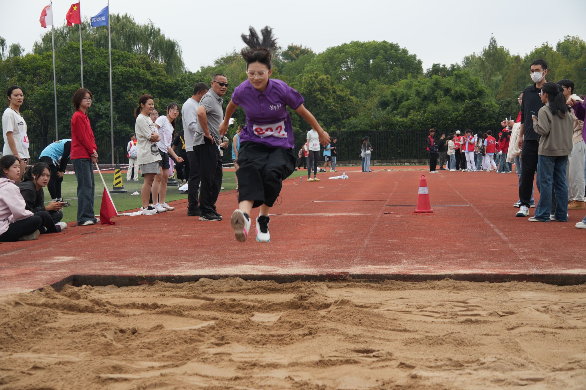行管2402班盛佳佳在女子三级跳项目中夺得第四名。一步,两步,起跳!矫健的身姿在半空中跃出一道优美的弧线,最终稳稳落地,以8.43米的好成绩展现了精彩一跳。