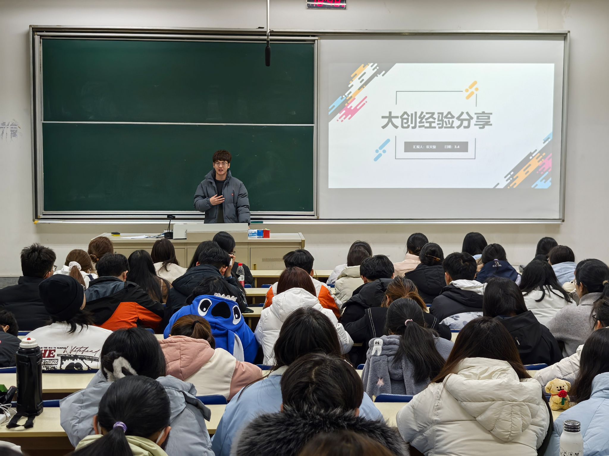 张文俊同学多次参与大创比赛,有着丰富的经验、前瞻性的思维,他着重于项目研究设计与实施和避坑指南方面的经验传授,由表及里、追根溯源,重点解释大创的意义与价值希望同学们能够把握实质,增色内容,避免“大而泛”的空洞成果。强调答辩上的亮点与高光,润色表述与表现,给人以感官上的优化。此外,他特别叮嘱同学们几点,比如,不要进度拖延、要合理管理经费、力争中期答辩、积极参与“互联网+”、“挑战杯”等竞赛,提升项目影响力。