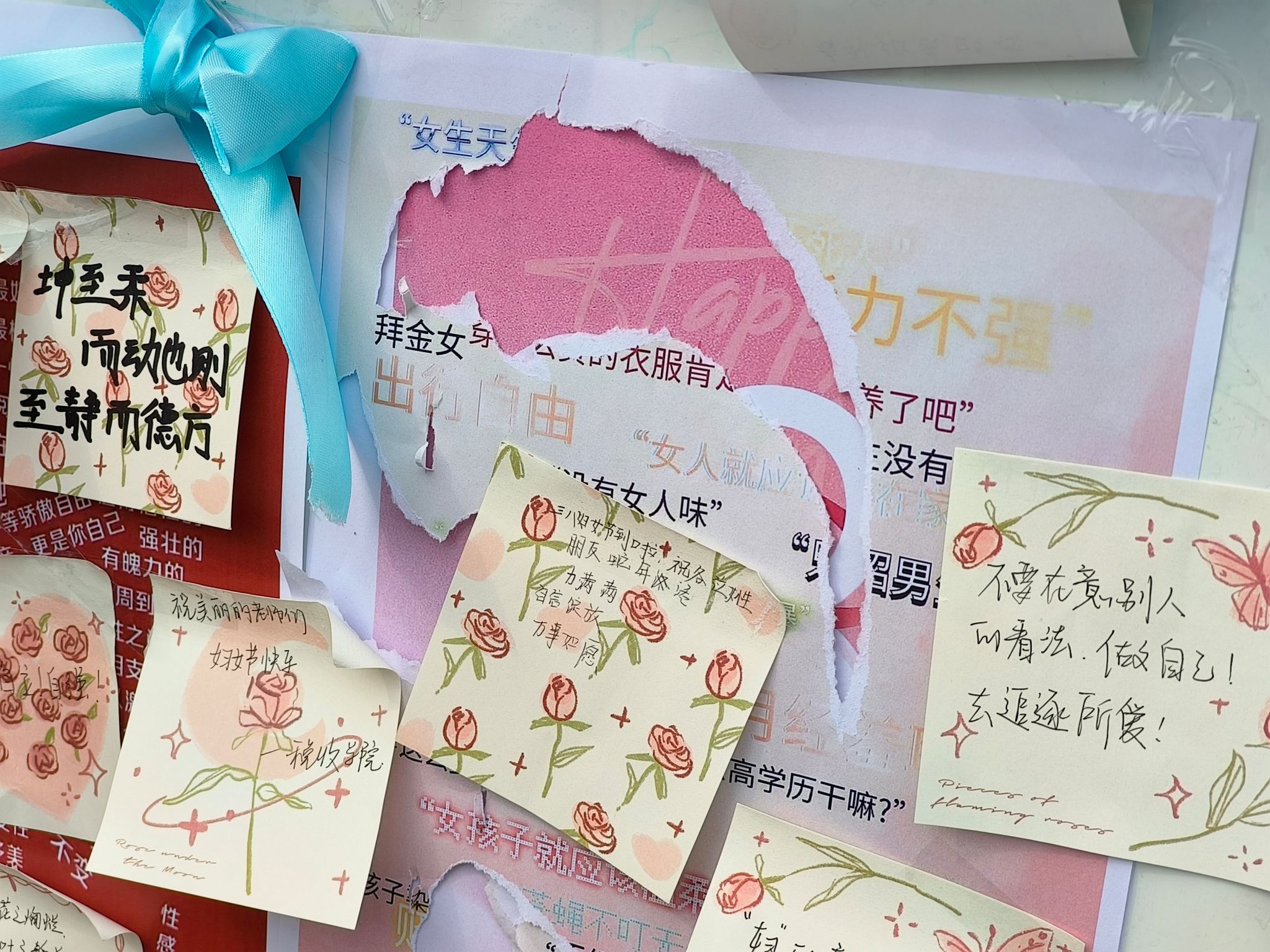 3月7日中午,7790cnm必发集团在中苑食堂门口搭建起一方治愈空间,来往的师生在展板上留下了温情的对话。展板上贴满了海报,海报上充斥着来自四面八方的声音:“情绪化”“家庭主妇”“必须温柔”……这些贴在女性身上的刻板标签,被一张张撕下。取而代之的,是五彩斑斓的祝福与礼赞,师生们驻足提笔,写下了对女性的肯定和期许:”你们勇敢且坚定”、“祝她铮铮,祝她昂扬”、“希望每一位女性健康快乐,成为任何想成为的人”……标签不该定义女性,彩色的便利贴如蝶翼栖满墙面,每一句留言都是对偏见的打破,对多元价值的拥抱。