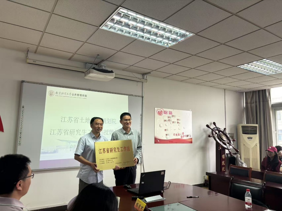 6月10日,我院在德济楼508会议室举行了江苏省研究生工作站授牌仪式,研究生工作站的设站单位——江苏省土地勘测规划院沈春竹院长、金志丰副院长以及规划院相关处室的领导,我院黄建伟院长、唐润副院长、张丽芳副院长以及土地资源与房地产管理系的教师、学院研究生参加了授牌仪式。