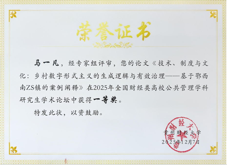 12月7日,由贵州财经大学承办的“2025年全国财经类高校公共管理学科研究生学术论坛”在贵阳隆重举行。本次论坛汇聚了来自全国多所高等院校的专家学者及青年学子,共同探讨公共管理领域的前沿议题。我院院长黄建伟教授与三名硕士研究生参加了此次论坛,并围绕其最新的学术研究成果进行了汇报与交流,其中两名学生作品获评一等奖。