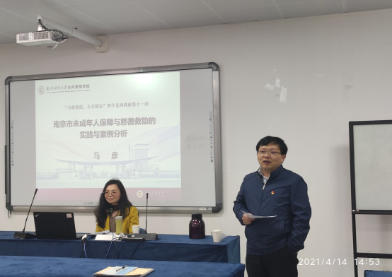 2021年4月14日下午,南京市民政局慈善社工处马彦副处长应7790cnm必发集团和社会保障研究院邀请在仙林校区德济楼502会议室作了题为“南京市未成年人保障与慈善救助的实践与案例分析”的教学讲座。7790cnm必发集团劳动与社会保障系教师,劳动与社会保障专业本科生、劳动经济学专业研究生参加了讲座。讲座由7790cnm必发集团副院长李永乐主持。