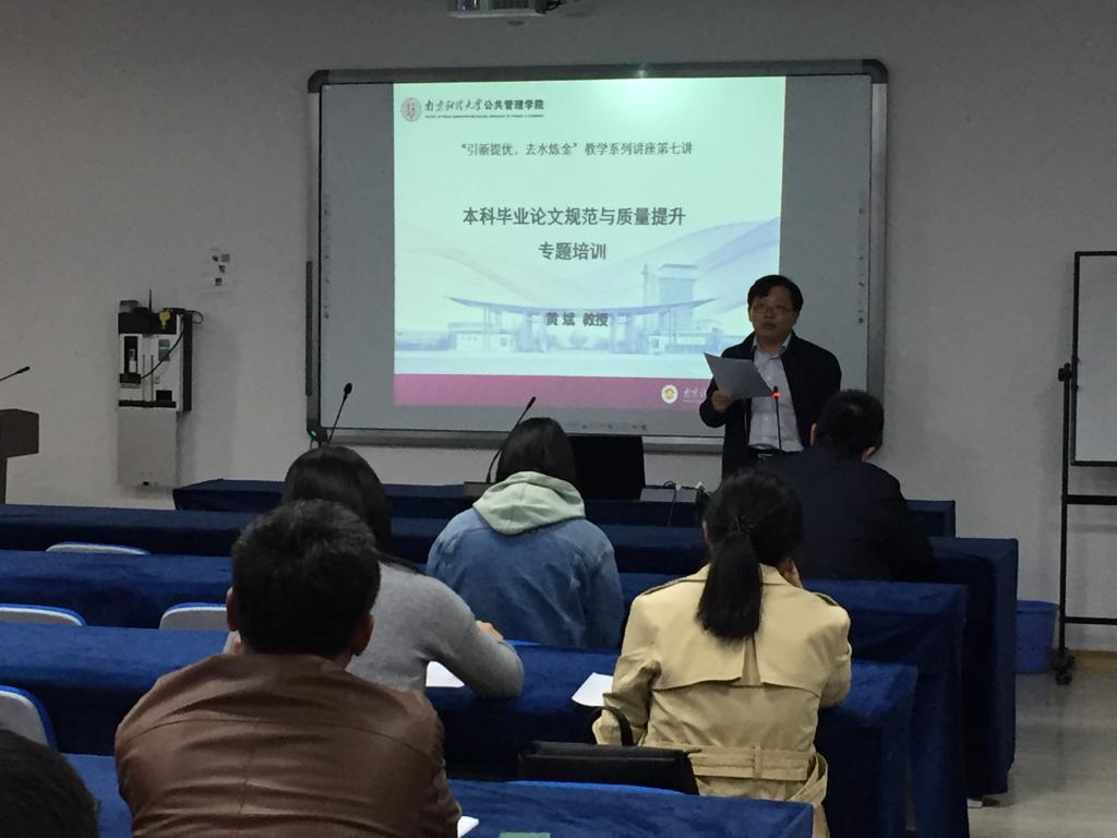 为提高本科毕业论文写作质量,提升毕业论文指导教师指导水平,我院于2019年11月6日下午举办了主题为“本科毕业论文规范与质量提升专题培训”的教学讲座。本次讲座由院长黄斌主讲,教学副院长李永乐主持。