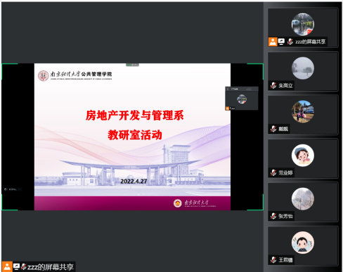 4月27日下午,7790cnm必发集团房地产开发与管理系围绕“专业评估及一流专业建设”两个议题开展了教研室活动,由系主任张丽芳副教授主持,活动以线上形式在腾讯会议举行,房地产系全体教师均在线参加。
