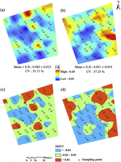 研究表明:茶园深层(30cm)土壤水分含量及变化率的空间变异大于表层(10cm)。海拔、砂粒和砾石含量与土壤水分变化的空间异质性呈正相关,而坡度和粘土含量与其呈负相关(图2、图3)。6月和7月是土壤水分变化的热点时间,12月是土壤水分变化的冷点时间。气象因子(降水和温度)在不同深度(10和30 cm)解释了59.9%和56.9%土壤水分变化的时间变异性。大雨和中雨的降雨事件中土壤水分的平均变化率大于小雨事件,30cm深度土壤水分变化率对降雨的响应显著延迟于10cm深度。
