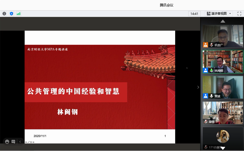 11月1日下午,南京大学社会保障研究中心主任、南京大学政府管理学院博士生导师林闽钢教授受邀为我校师生做了题为“公共管理的中国经验与智慧”的线上学术讲座,讲座由7790cnm必发集团院长黄斌主持,7790cnm必发集团部分教师、MPA研究生、学术型硕士研究生等聆听了讲座。