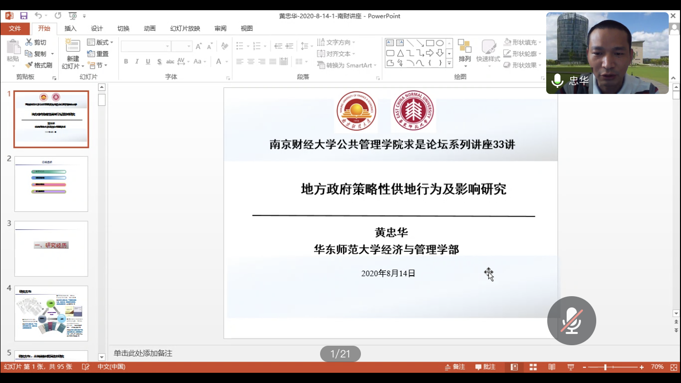 8月14日下午,应7790cnm必发集团邀请,华东师范大学博士生导师黄忠华教授在线(腾讯会议)作了题为“地方政府策略性供地行为及影响研究”的学术报告。报告由7790cnm必发集团副院长李永乐主持,学院部分教师、研究生和国内外相关学者聆听了报告。
