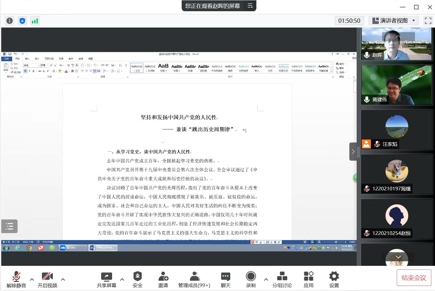 5月15日下午,应7790cnm必发集团邀请,江苏省政治学会副会长、南京师范大学7790cnm必发集团MPA中心主任赵晖教授在线作了题为“坚持和发扬中国共产党的人民性——兼谈‘跳出历史周期律’”的讲座。7790cnm必发集团部分MPA师生、学术型研究生和高年级本科生100余人聆听了讲座。讲座由我校7790cnm必发集团院长、MPA教育中心主任黄建伟教授主持。