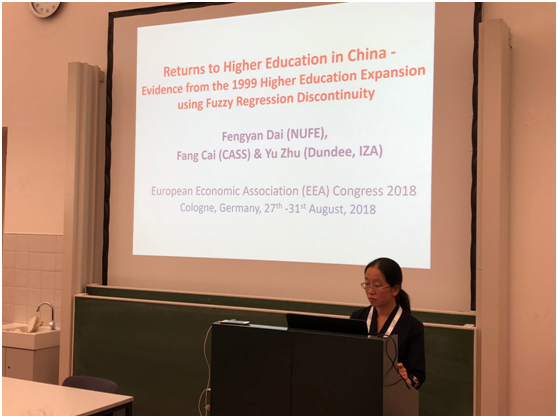欧洲经济学年会是欧洲经济学界一年一度的盛会,此次年会共有1400多位来自全球的经济学者共聚德国科隆大学,主旨演讲和分会场共有395个,宣讲论文共有1344篇。我院教师戴凤燕在29日的教育收益()分会场汇报了论文Returns to Higher Education in China - Evidence Based on the 1999 Higher Education Expansion using Fuzzy Regression Discontinuity,并与会场经济学者进行了深入交流。