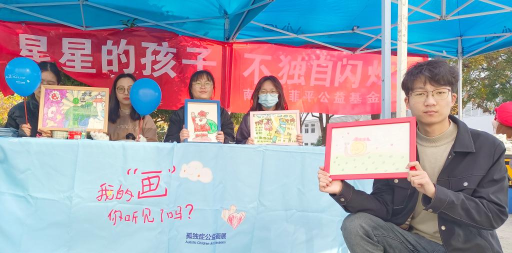 在活动现场,穿着玩偶服的志愿者热情地邀请路过的同学来到帐篷前欣赏来自孤独症儿童们的画作,并认真仔细地为过路的同学们介绍着有关孤独症的相关知识,以及该如何与孤独症儿童相处的方法,同学们也是听得十分认真,有的同学表示会持续关注这一群体,并一有相关的活动就一定尽自己所能地为这些天使们提供帮助,有的师生直接捐赠善款,为治疗孤独症儿童的公益事业助一把力。义卖现场十分热闹,过路的同学们纷纷在表白墙上写下自己对孤独症儿童的祝福。最终将拍卖所得1013元爱心善款全数捐赠至南京科菲平公益基金会,用于帮助孤独症儿童的项目。