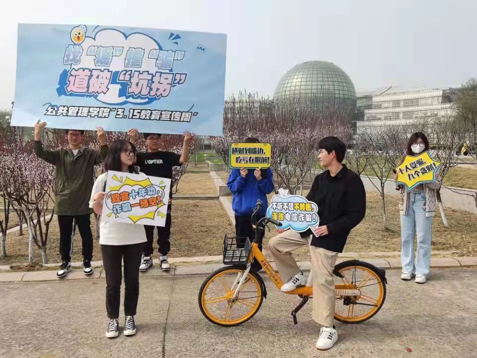 “防诈顺口溜”“倒背如流”和“看谁答得快”维权知识抢答游戏,提高了同学们对消费欺诈形式、欺诈种类、欺诈用语的认识,帮助同学们快速识别“消费骗局”。“谁是卧底”剧本杀游戏模拟身边真实案例,教同学们揪出“卧底”(骗子),提高他们的防骗意识。玩完游戏,同学们走出教室,以单车骑行和放飞手工DIY纸鸢的方式进一步宣传消费者权益知识,厚植维权理念。青年学子们脚踩自行车、手举宣传牌,穿梭于鲜花怒放的春日校园,向大家科普反诈常识和维权知识,吸引了不少学生驻足观看。蓝蓝的天空中,色彩缤纷的纸鸢在空中时高时低,迎风招展。一个个美好心愿随纸鸢飞上天空,祝愿天下消费皆公平;一句句无声呐喊随风飘向远方,叮嘱人们消费要维权。