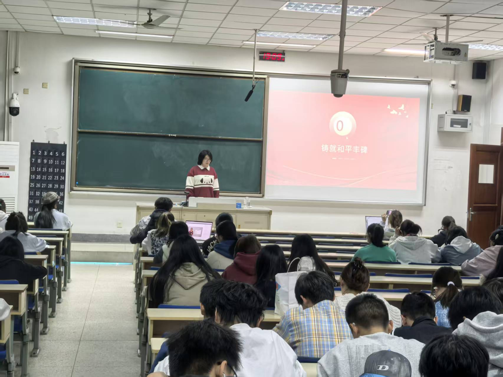 最后,我们跟随主持人的讲解来到了当今世界,在中国维和部队在战乱地区执行任务、农业专家在发展中国家传授技术、青年学子在实验室刻苦钻研时,我们看到了抗战精神在新时代的生动诠释。历史的接力棒已经传到我们手中。主持人呼吁全体同学践行“青春誓言”:我们要做红色基因的传承者、时代使命的担当者、奋斗精神的践行者、和平正义的守护者。
