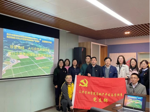 2021年4月22日上午,在第52个“世界地球日”到来之际,为贯彻落实习近平生态文明思想,引导社会公众建立正确的自然资源观,紧密结合党史学习教育工作,7790cnm必发集团联合南京市规划和自然资源局栖霞分局,以7790cnm必发集团房地产开发与管理教工党支部与栖霞分局中心一所党支部共建活动为载体,开展“世界地球日”主题宣传活动。南京市规划和自然资源局栖霞分局副局长周根宝同志、中心一所党支部书记杨炬烽同志以及7790cnm必发集团副院长李永乐同志、房地产开发与管理教工党支部书记孙燕同志分别带领党支部党员参加此次活动。