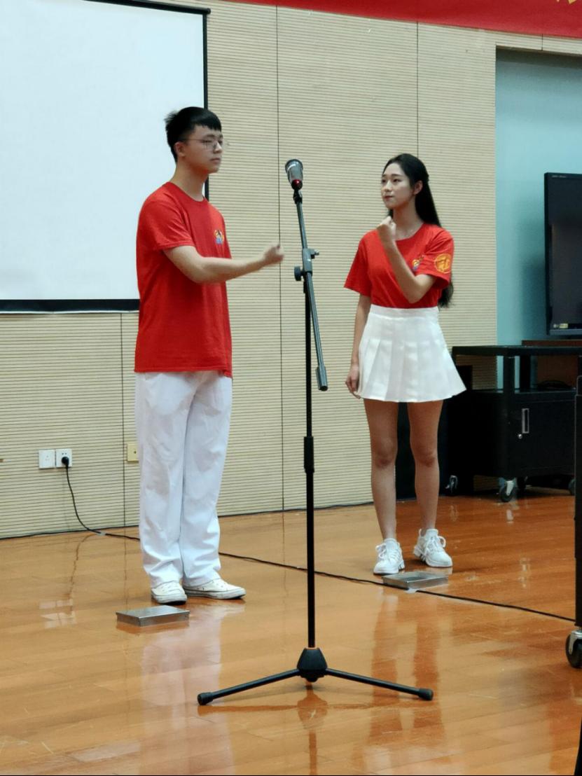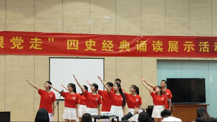 我院《党旗颂》诵读,演绎形式多样,演绎者精神饱满、感情真挚,将动作、朗诵和背景音乐三者合一。在背景音乐出错的时刻“临危不乱”,在话筒收声不佳的状况中表现更优,这不仅体现了我院学子高超的诵读水平,更表达了我院学生对国、对党深切的热爱。