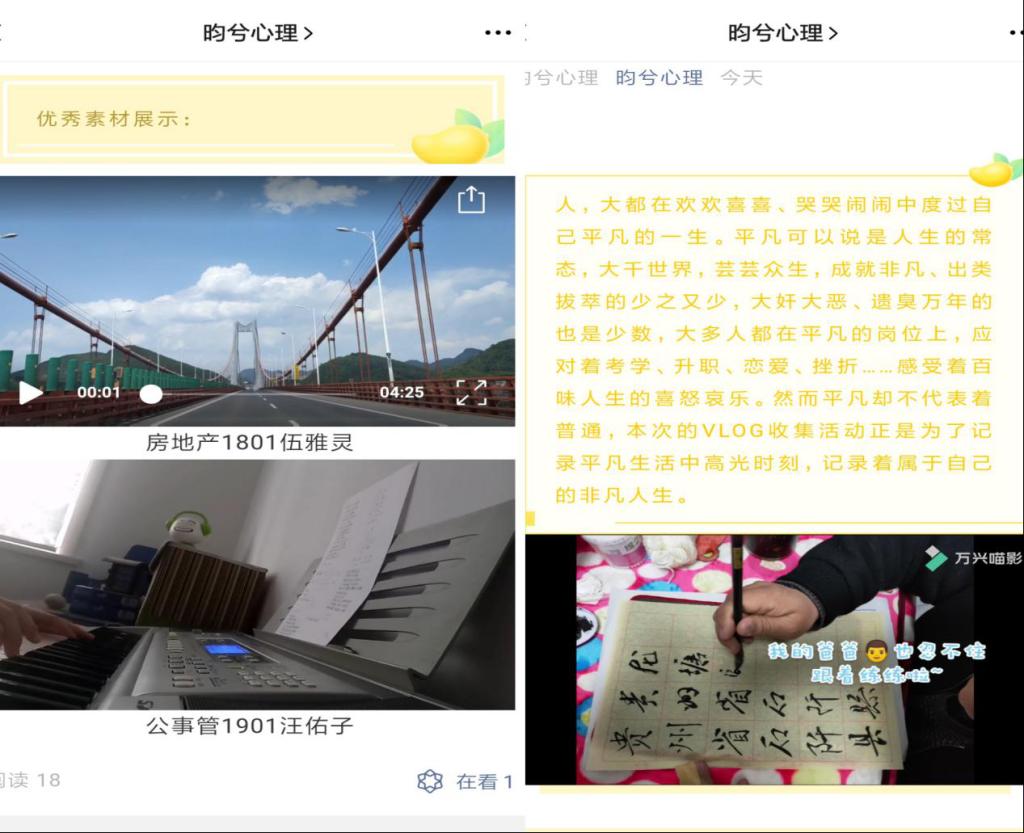 我们都是平凡的人,可是芸芸众生中我们却又独一无二,无数次的挫折与磨难让我们陷入心理的困境,但是生活中每一处都是光彩,你平凡而不普通。我院昀兮心理开展“平凡却不普通的一天”VLOG活动,同学们通过视频记录自己的生活,与家人温馨的相处,与朋友欢乐的时光。其中房地产1801的伍雅灵同学的投稿丰富而精彩,一天的时光漫漫而有趣,公事管1901汪佑子同学一段精彩的自弹自唱,都是同学们生活中真实的片段。