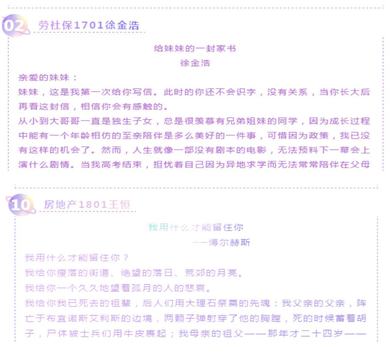 心理健康协会同学王恒表示,从同学们的朗读投稿中发现并感觉到同学们的昂扬乐观与心中的美好,它们是亲情、是友情抑或是爱情,生活中诸多美好被同学们用笔写下,用言语讲述,谆谆文字中显现脉脉情深。