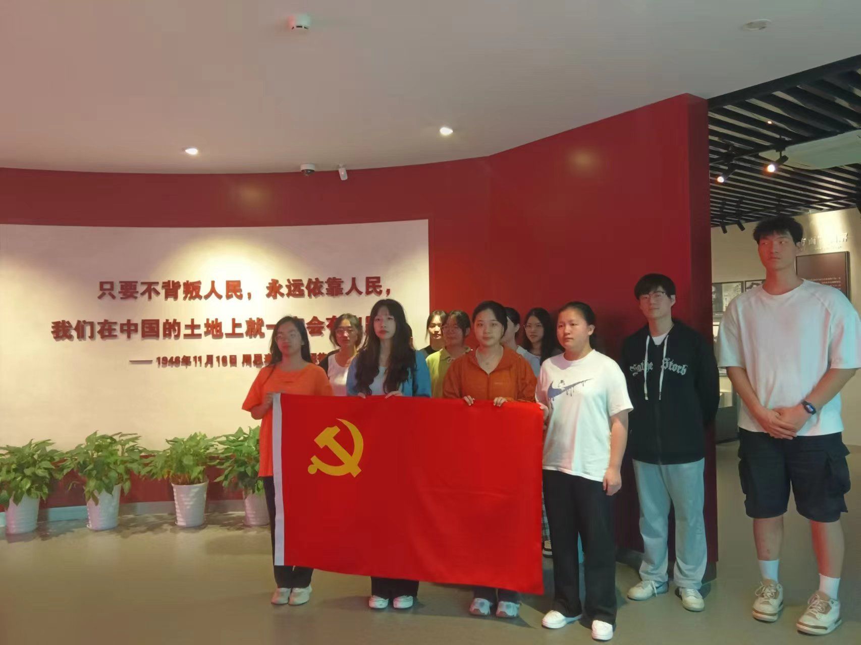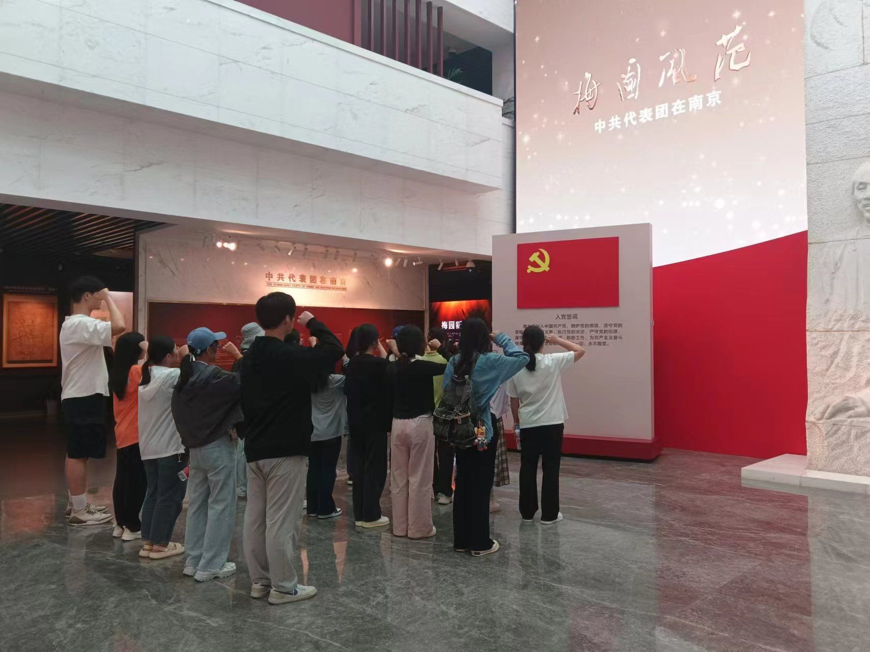 活动伊始,全体学生党员在周恩来总理铜像前献花。面对着威严的周总理铜像,学生党员们满是崇敬。在工作人员组织下,全体学生党员依次进行献花。献花结束后,全体学生党员进入展厅,在入党誓词前庄严宣誓。