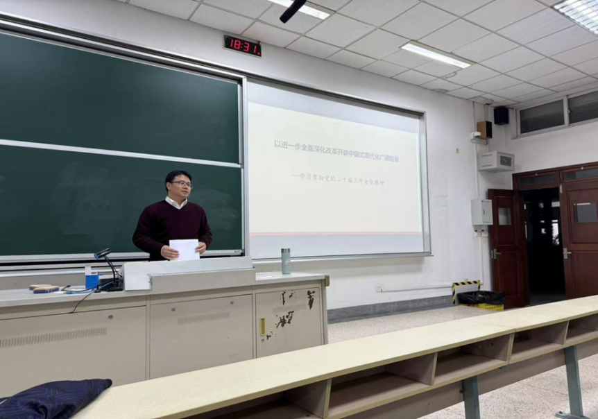 11月19日下午6点30分,我院院长、研究生党支部政治辅导员黄建伟教授在德济楼112教室为研究生党支部全体党员讲授题为“以进一步全面深化改革开辟中国式现代化广阔前景——学习贯彻党的二十届三中全会精神”的专题党课。研究生党支部全体党员和党的发展对象参加党课学习。