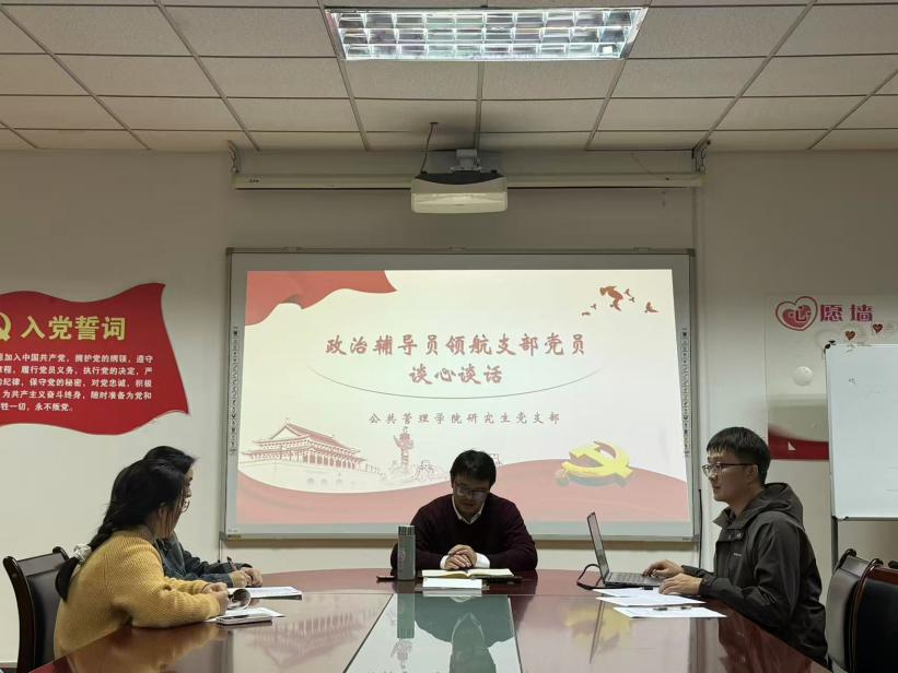 为深入了解研究生党员在学习与生活中的实际情况,精准回应学生关切,11月7日晚8点,我院院长、研究生党支部政治辅导员黄建伟教授在德济楼508会议室与支部党员开展谈心谈话活动。